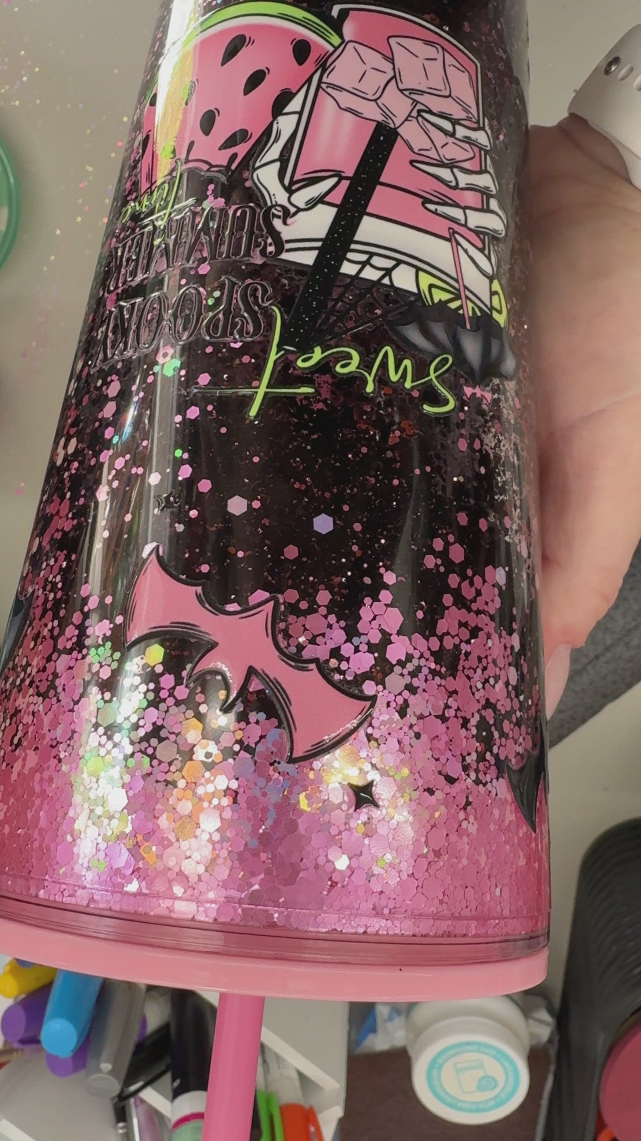 Spice up your summer sipping with our Sweet Spooky Snowglobe Tumbler! This 24oz tumbler features a playful pink and black design filled with glitter and spooky bats. Embrace the summer vibes with a touch of Halloween and never have a dull drink again!